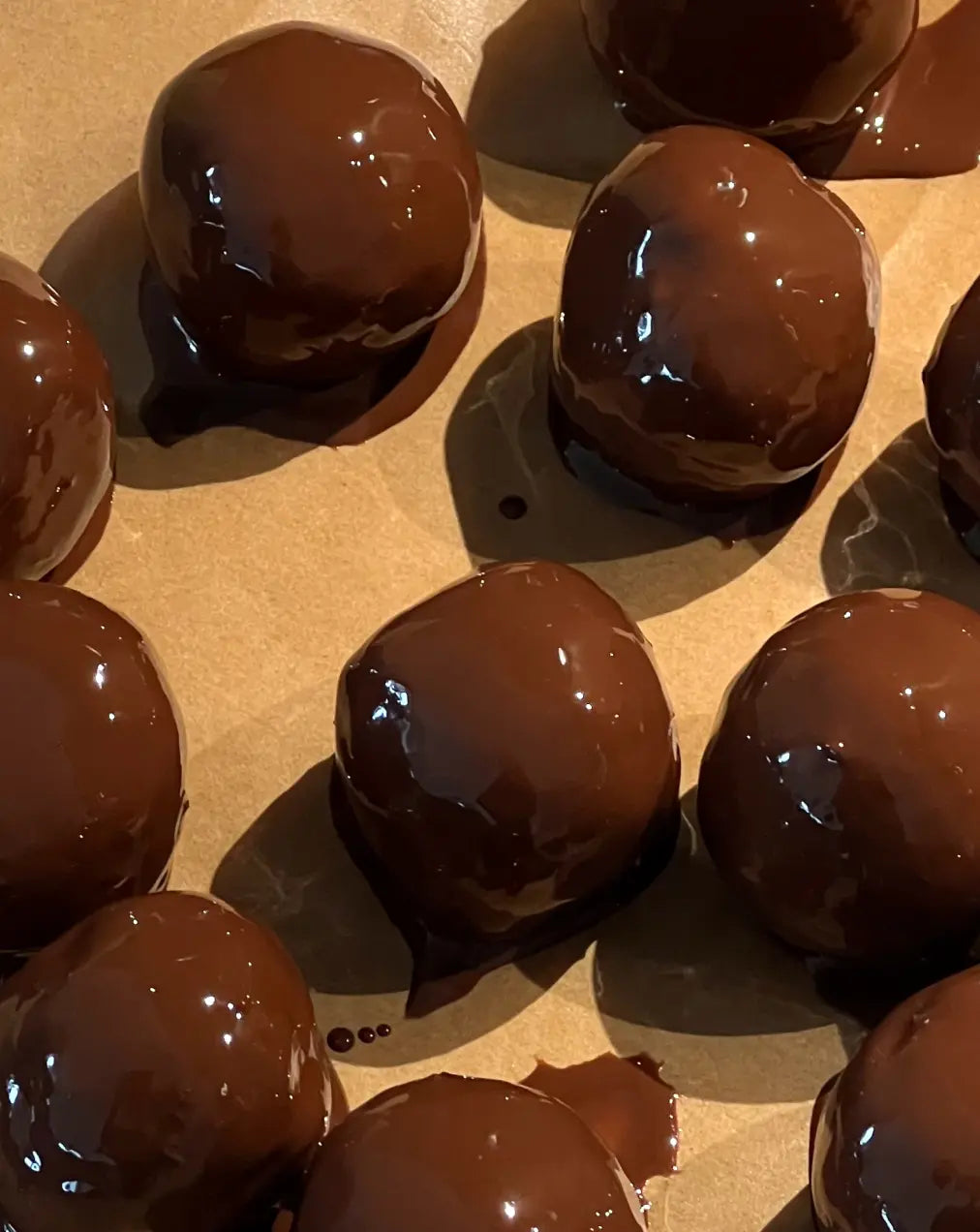 Die Pralinen im Kühlschrank oder Gefrierfach abkühlen lassen. Dann sind sie fertig zum Servieren oder können mit einem Schokoüberzug verziert werden.