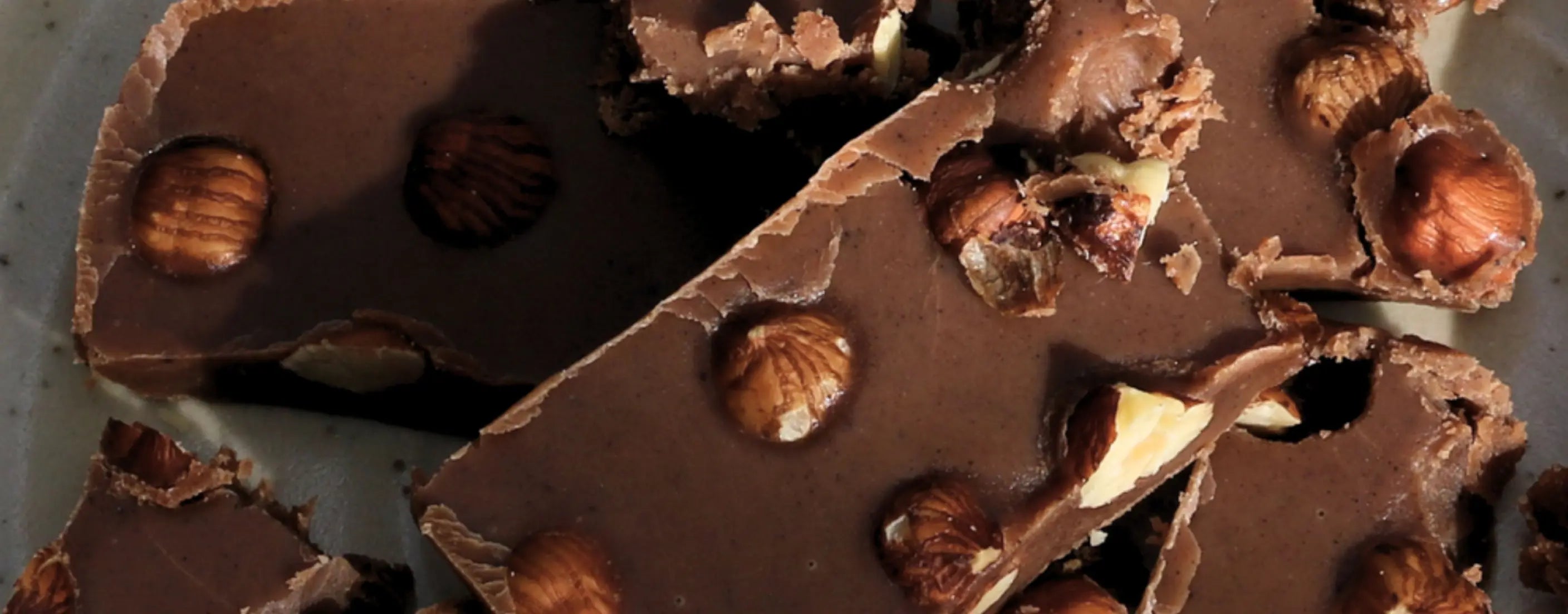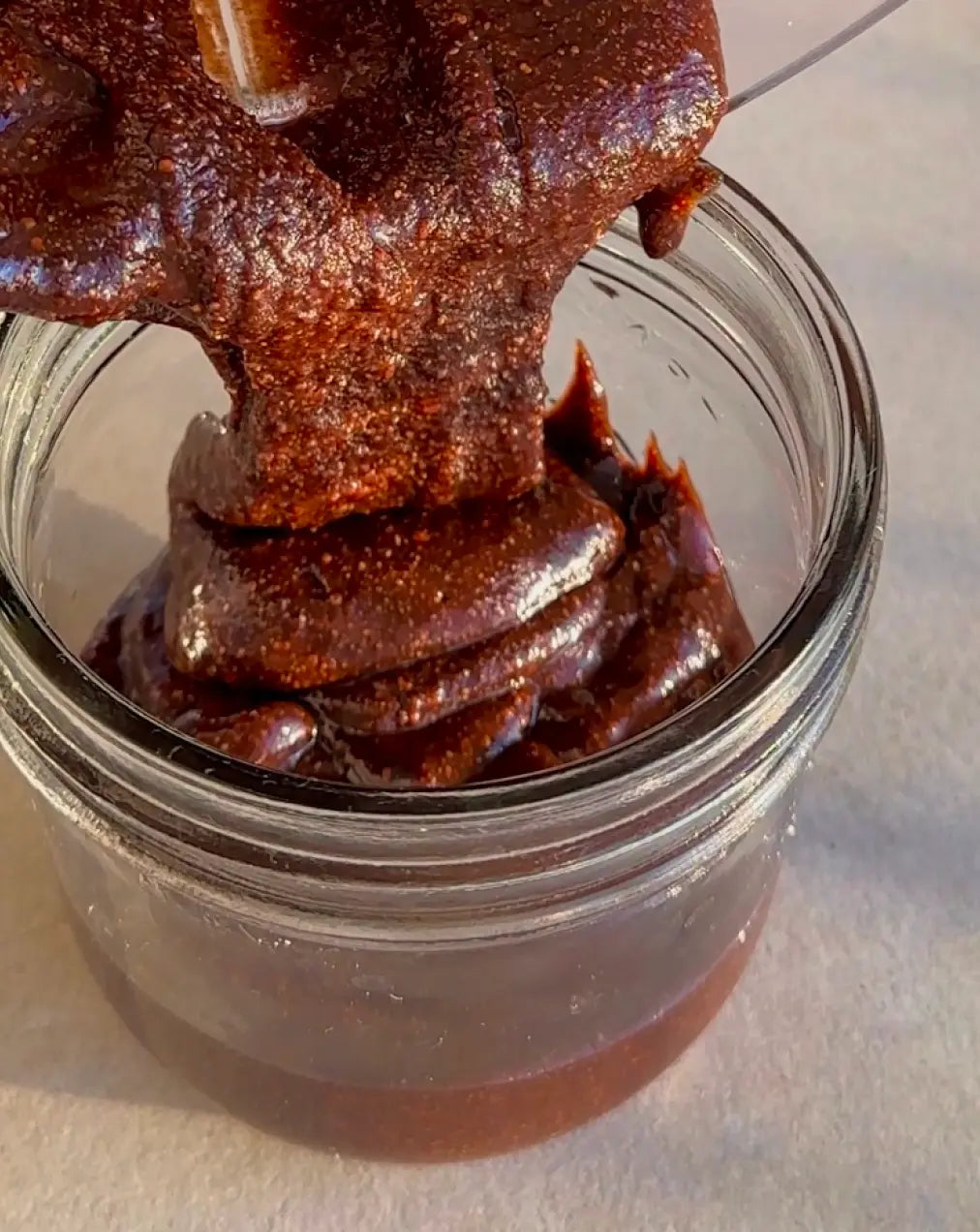 In einer Schüssel das Haselnussmus zusammen mit Ahornsirup, Kakao, Kakaobutter, Kokosöl, einer Prise Salz und einem Teelöffel Magic Brew zu einer sanften Creme vermengen