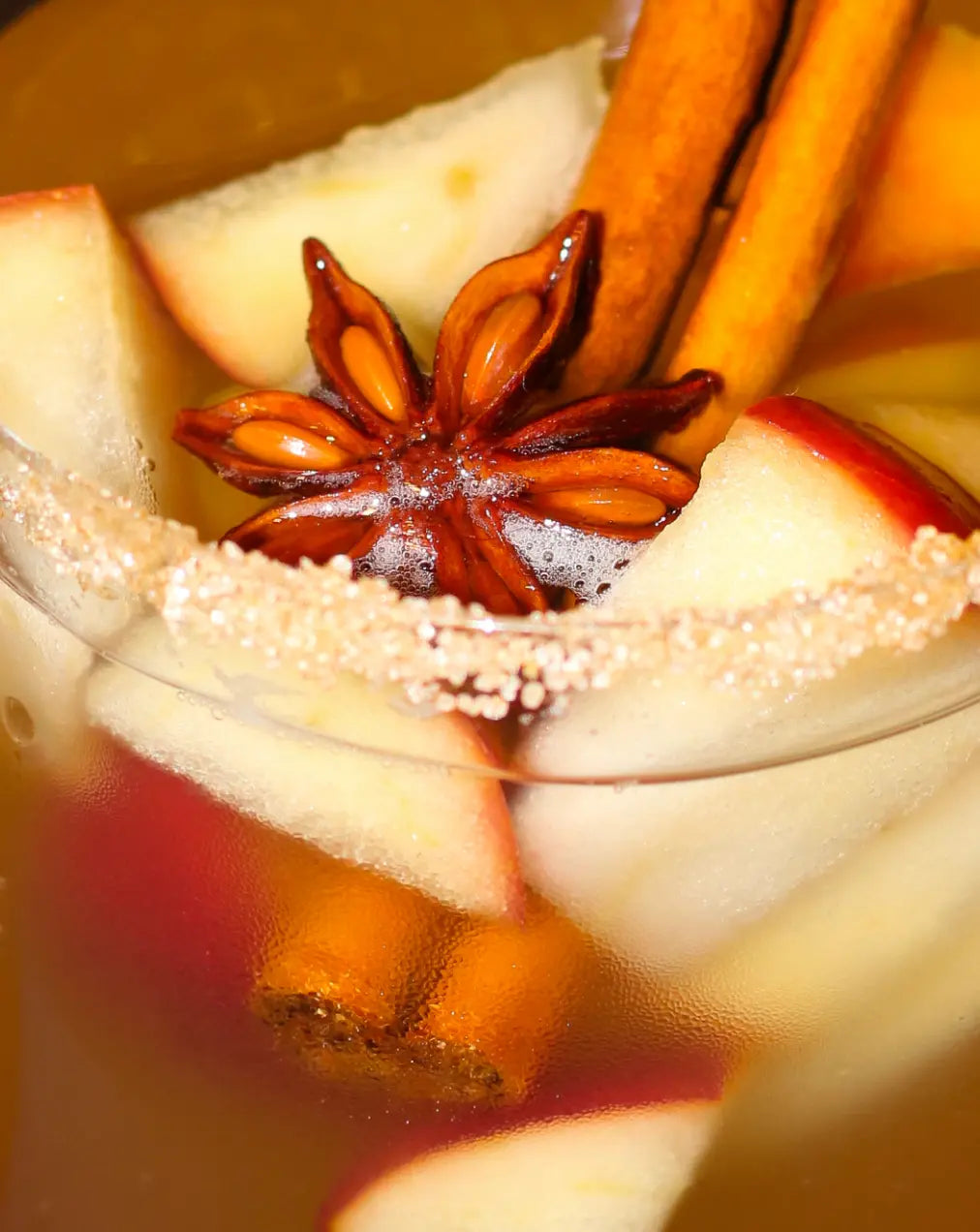 Glas dekorieren: Den Zucker mit Wintergewürzen vermengen. Dann den Rand des Cocktailglases mit einer Orangenscheibe oder Wasser befeuchten. Das Glas vorsichtig in der Zuckermischung schwenken.